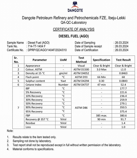 DANGOTE REFINERY OIL SPECIFICATION